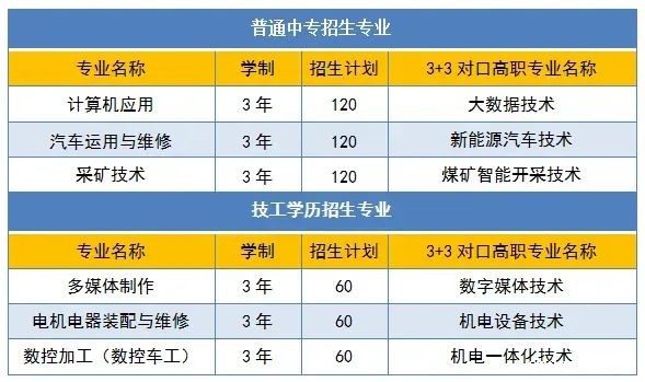 注:2022年招生的中专或技工专业均可直接报读我院“3+3”中高职贯通班,“3+3”中高职贯通班在校学习时间为六年,前3年在中专部就读,后三年进入本院对口高职专业学习。